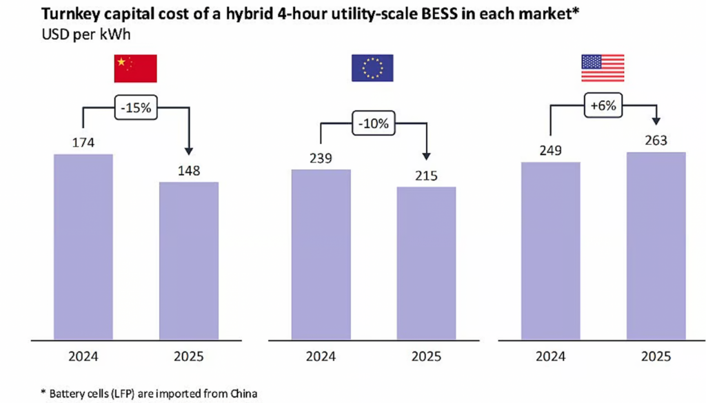 Entre 2020 y 2025, la capacidad global de BESS creció a una tasa anual compuesta superior al 100 %. La mejora de la viabilidad económica de los BESS a gran escala está estrechamente ligada a la reducción de costes llave en mano. En 2025, China marcó el referente global con costes de capital en torno a 148 $/kWh (aproximadamente 136 €/kWh) para sistemas híbridos de 4 horas. En Europa, el coste medio descendió cerca de un 10 % hasta 215 $/kWh (unos 198 €/kWh). En contraste, en Estados Unidos los costes aumentaron alrededor de un 6 % hasta 263 $/kWh (aproximadamente 242 €/kWh), debido en parte a aranceles y políticas comerciales que encarecen componentes importados y la fabricación local.