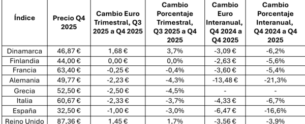 A escala europea, el cuarto trimestre de 2025 confirma la tendencia bajista de los PPA solares, con una caída trimestral adicional del 1% en el índice continental de LevelTen y un descenso interanual cercano al 8% en el P25. El desequilibrio entre la rápida expansión de la oferta renovable y una demanda eléctrica que crece a menor ritmo, junto con la proliferación de precios negativos, está reduciendo el valor de mercado de la generación solar pura en múltiples países.