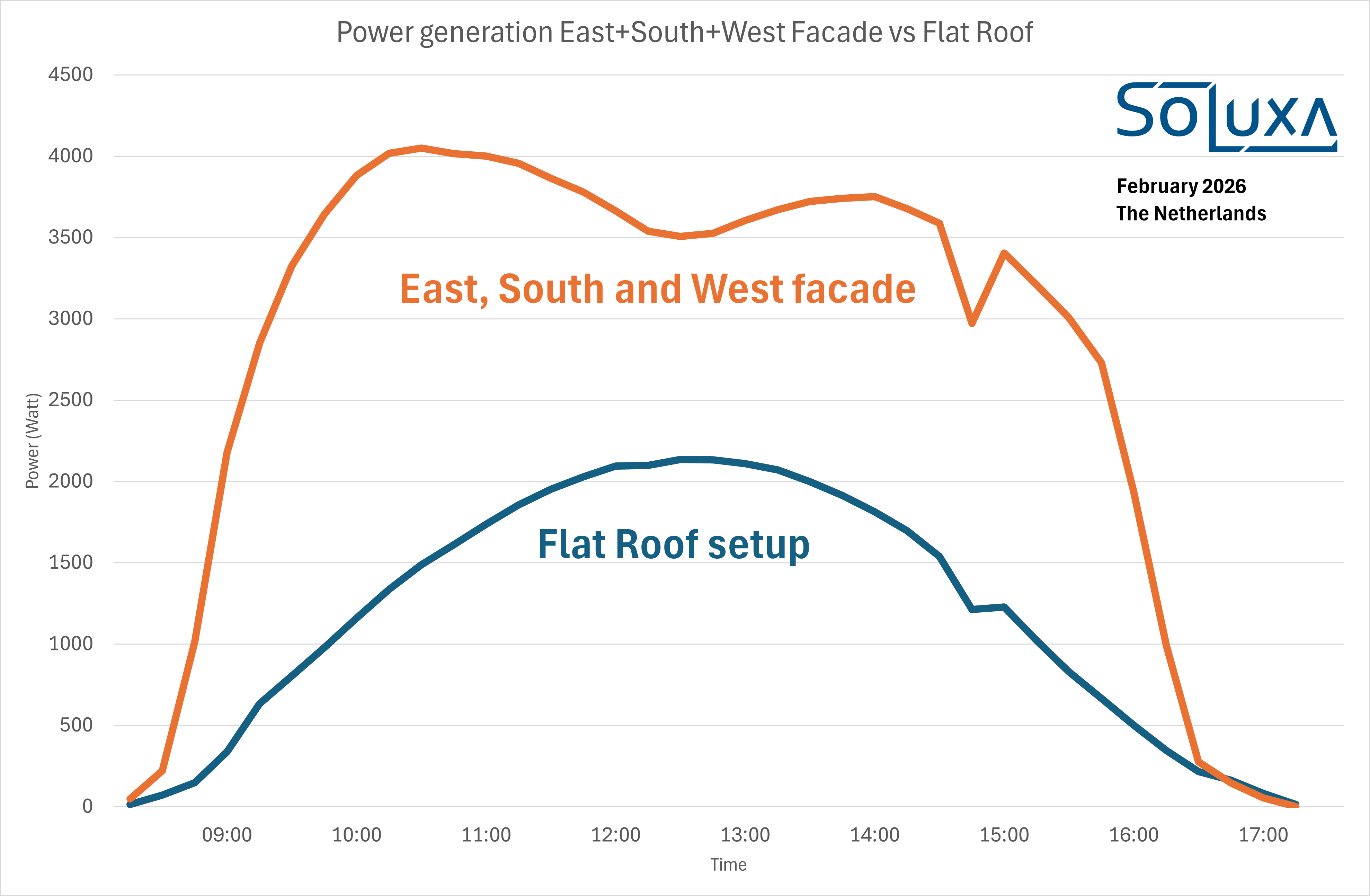 El gráfico adjunto mostraría una comparación entre la generación energética de las tres fachadas y la cubierta plana. Los sistemas en fachada presentarían un perfil de generación significativamente más favorable.