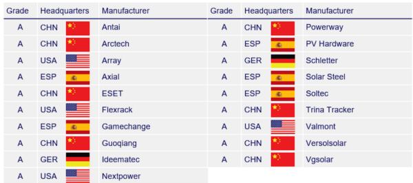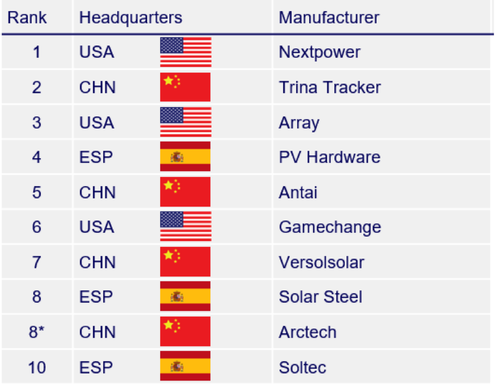 Según esta nueva metodología, la empresa estadounidense Nextpower (anteriormente Nextracker) ha alcanzado el primer puesto, seguida por el fabricante chino Trina Tracker en segundo lugar y otra empresa estadounidense, Array, en tercer lugar. Hay tres empresas españolas en este listado: PV Hardware en el 4.ºpuesto, Solar Steel, en 8.ª posición, y Soltec en 10º lugar