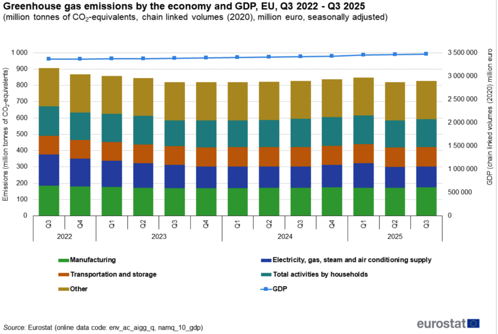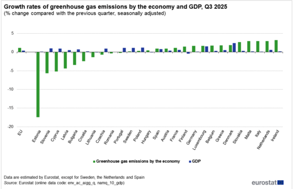 Las emisiones de gases de efecto invernadero ajustadas estacionalmente aumentaron en 17 países de la UE y disminuyeron en 10 países en comparación con el segundo trimestre de 2025. Las mayores reducciones de gases de efecto invernadero se estimaron para Estonia (-17,4 %), Eslovenia (-5,7 %) y Chipre (-5,2 %). De los diez países de la UE que registraron descensos en las emisiones de gases de efecto invernadero, solo Lituania registró también un descenso del PIB. Los otros nueve países de la UE (Bulgaria, Estonia, Croacia, Chipre, Letonia, Lituania, Portugal, Rumanía y Eslovenia) han reducido sus emisiones al tiempo que han aumentado o mantenido sus niveles de PIB.