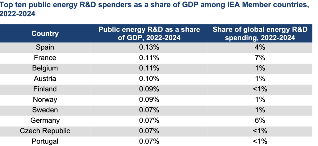 En 2025, la seguridad energética se situó como el principal motor de la innovación, por delante del coste o la descarbonización. En Europa, esta orientación se refleja en instrumentos como el propuesto Fondo Europeo de Competitividad y en el refuerzo del gasto público en I+D energética, que alcanza ya el 0,08% del PIB y se acerca al umbral del 0,1% considerado estratégico. Según la AIE, España es el país miembro de la AgenciaE que más invierten en I+D en materia de energía como porcentaje del PIB, con un 0,13%.