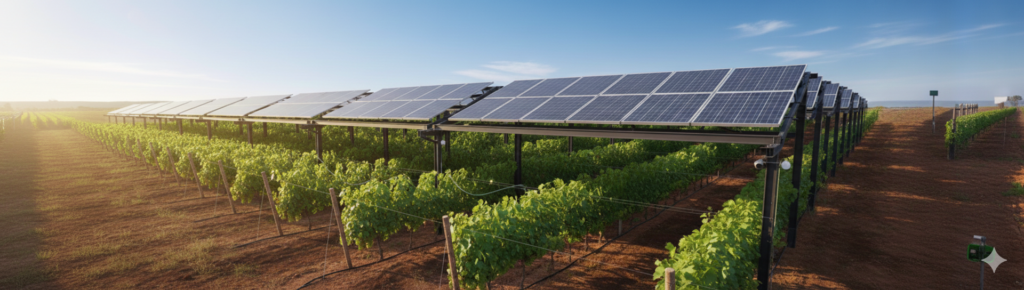 La instalación se plantea como un invernadero abierto con paneles solares dinámicos que ajustan su posición según las necesidades del cultivo. El sistema busca crear un microclima favorable para las vides, reducir la evapotranspiración, disminuir el riego y generar mapas digitales para el control de la producción.
