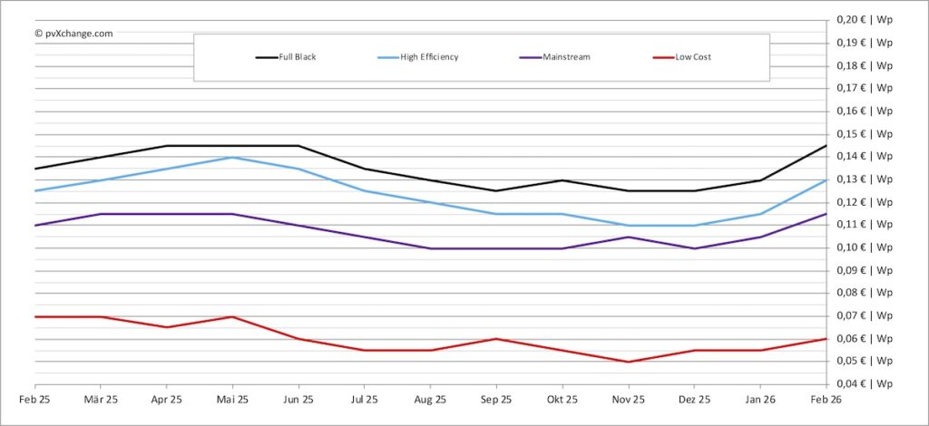 Los precios de los módulos aumentaron más de lo previsto en febrero en todas las principales clases tecnológicas. La mayoría de los productos subieron entre 0,01 y 0,015 €/Wp. Los módulos para pequeños sistemas de tejado registraron aumentos mayores que los productos a escala industrial. Los precios han superado los niveles de enero de 2025 y ahora se sitúan entre un 15 % y un 18 % por encima del mínimo de diciembre de 2024.