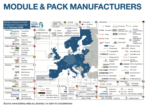El instituto RWTH Aachen University de Alemania ha publicado la tercera edición del “Battery Atlas 2026”, elaborado por la cátedra Production Engineering of E-Mobility Components (PEM), un informe online y gratuito que cartografía la cadena de valor europea de las baterías de ion-litio. La publicación, titulada Mapping the European Lithium-Ion Battery Industry, ofrece una visión basada en datos de toda la industria, desde la producción de celdas hasta módulos y packs, incluyendo maquinaria, materiales, control de calidad, reciclaje y el desarrollo de futuras generaciones de baterías.