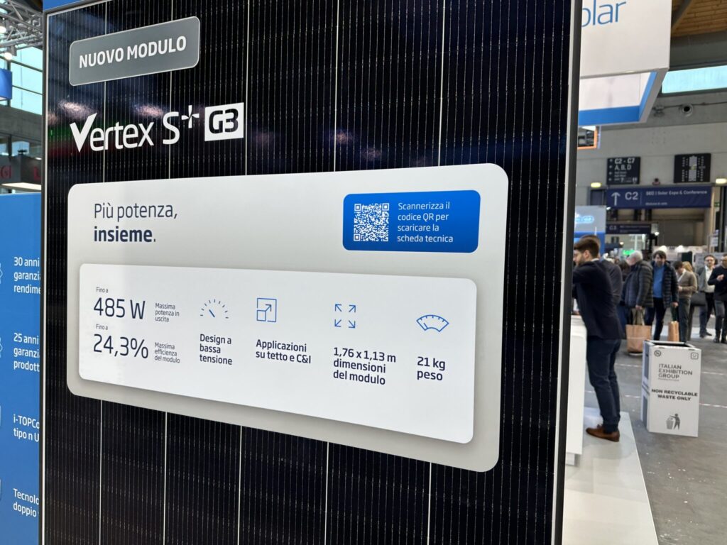 El fabricante chino Trina Solar presentó la tercera generación de su tecnología TOPCon aplicada a módulos para cubiertas con la serie Vertex S+ G3. Los nuevos paneles ofrecen potencias entre 465 W y 495 W y eficiencias de hasta 24,3%, con tensiones en circuito abierto de 37,1 V a 37,9 V y corrientes de cortocircuito de hasta 16,08 A.