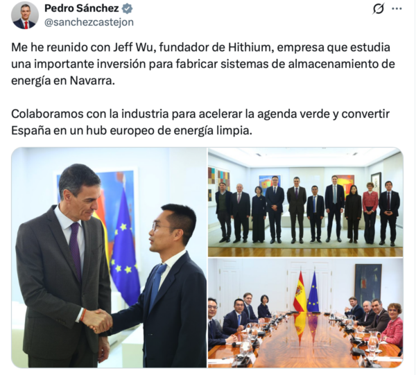 La multinacional china Hithium estudia instalar en Navarra una planta de fabricación de baterías y sistemas de almacenamiento energético con una inversión inicial de alrededor de 400 millones de euros y la creación potencial de hasta 1.050 empleos entre dos fases de desarrollo. El Presidente del gobierno, Pedro Sánchez, publicó el lunes en sus redes que se había «reunido con Jeff Wu, fundador de Hithium, empresa que estudia una importante inversión para fabricar sistemas de almacenamiento de energía en Navarra». Este martes, la presidenta de Navarra, María Chivite, ha dado a conocer la firma de una carta de intenciones entre el Gobierno foral y la compañía.