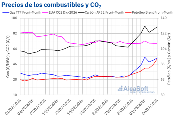 En la primera semana de marzo, los precios de la mayoría de los principales mercados eléctricos europeos aumentaron respecto a la semana anterior y la mayoría alcanzó promedios semanales superiores a 80 €/MWh. En Italia y Reino Unido se registró el precio diario más alto desde febrero de 2025. La subida de los precios del gas, como consecuencia del conflicto en Irán, favoreció estos incrementos. Los futuros de gas TTF registraron el precio de cierre más alto desde febrero de 2025, mientras que los futuros de Brent alcanzaron su nivel más alto desde septiembre de 2023.
