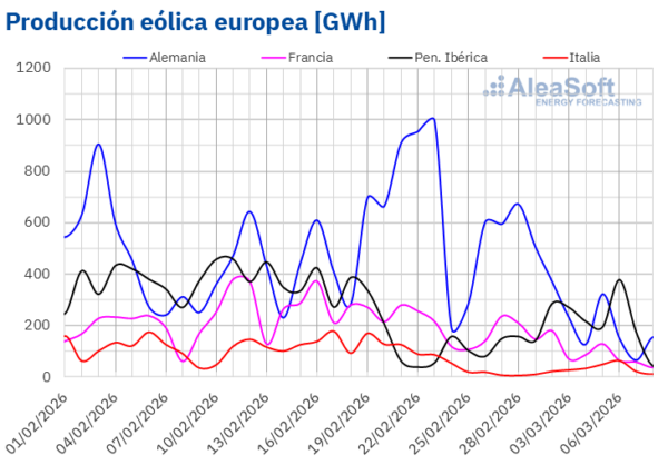 En la segunda semana de marzo, según las previsiones de producción eólica de AleaSoft Energy Forecasting, la producción con esta tecnología aumentará en los mercados de Francia y Alemania, lo que revertirá la tendencia a la baja. Sin embargo, los mercados de la península ibérica e Italia registrarán descensos en la generación eólica.