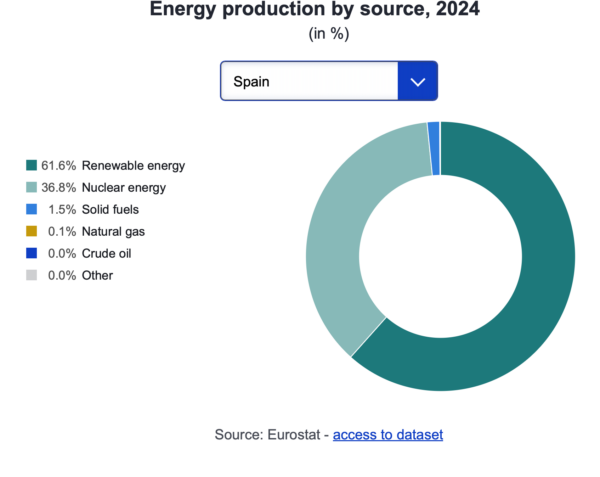 Sin embargo, el peso de las renovables varía significativamente entre los Estados miembros. Mientras en Malta el 100% de la producción de energía tuvo origen renovable, en otros mercados siguen teniendo mayor protagonismo tecnologías convencionales, como en el caso de Dinamarca donde el 29 % de su energía procede del petróleo. En España el 61,6 % de la generación tuvo origen renovable, el 36,8 fue nuclear, el 1,5 % se generó a partir de combustibles sólidos y el 0,1 % de gas natural.