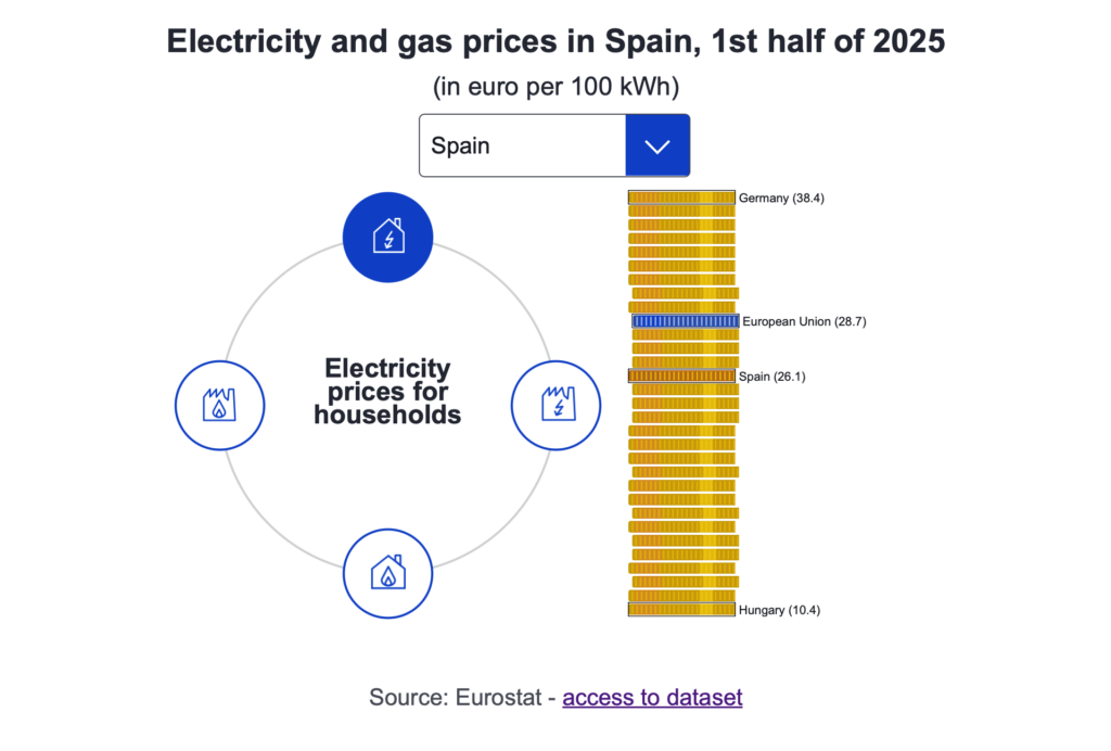 En cuanto a los precios de la electricidad y el gas para para hogares correspondientes a la primera mitad de 2025, Alemania lideró los precios más altos con 38,4 € / MWh, frente a los 10,4 € / MWh de Hungría. En España, el promedio fue de 26,1 € / MWh, y el promedio de la UE, de 28,7 € / MWh.