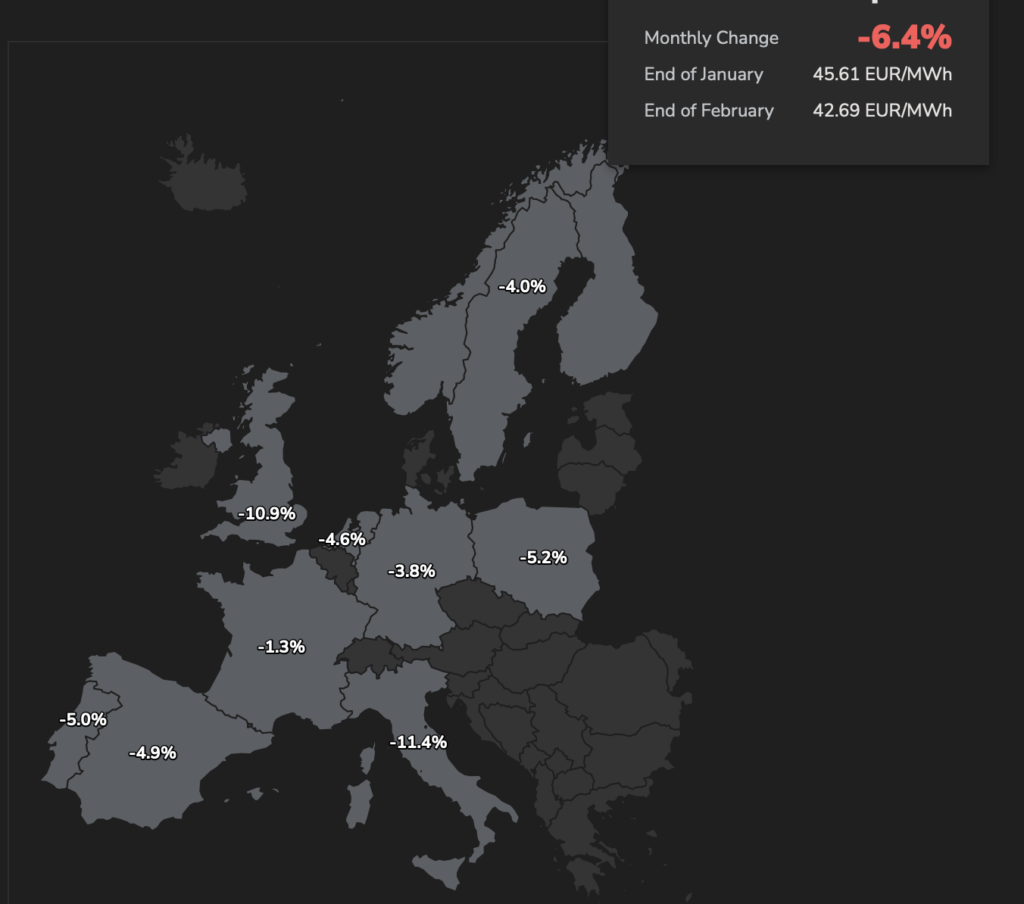 El índice Euro Composite de la consultora suiza Pexapark registró una caída del 6,4 % en febrero, hasta situarse en 42,7 EUR/MWh, en un contexto de descenso generalizado de los precios de los contratos de compraventa de energía (PPA) en Europa.