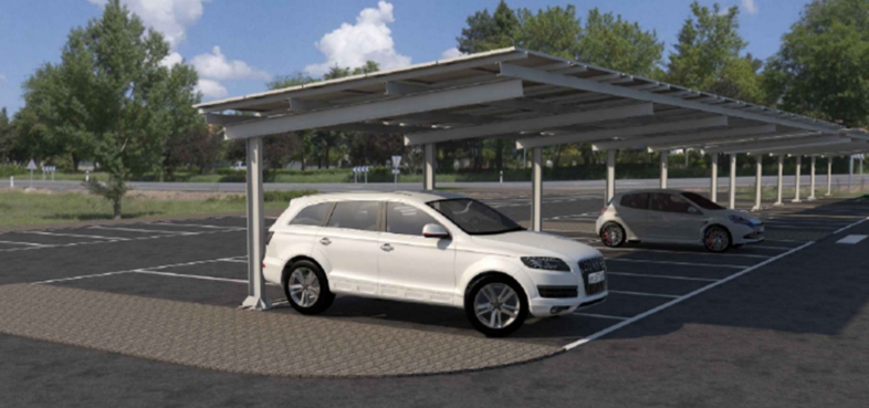 - Marquesina fotovoltaica para la cobertura de 8 vehículos en un aparcamiento exterior, de 22.338 x 5.600 mm y 20 kW de potencia total instalada. Estará formada por una estructura de acero galvanizado con pilares, vigas y correas, con uniones atornilladas en obra, 2,2 metros de altura libre en la parte baja, un ángulo de inclinación de 5 grados y una separación de 5 metros entre pilares. La cubierta contará con 36 módulos fotovoltaicos de 605 W.