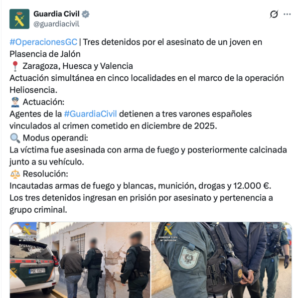 La Guardia Civil ha detenido a tres varones españoles en el marco de la operación “Heliosencia”, destinada a esclarecer el asesinato de un hombre de 29 años ocurrido el 2 de diciembre de 2025 en Plasencia de Jalón.