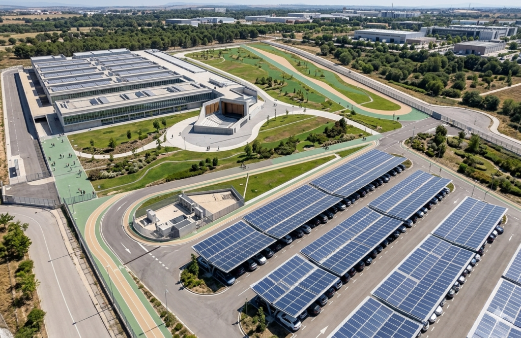 La instalación fotovoltaica prevista cubriría 612 plazas mediante seis marquesinas tipo pórtico doble, con dos filas de vehículos por estructura. Sobre estas marquesinas se estima la instalación de unos 3.000 módulos solares de 550 W, ocupando una superficie aproximada de 10.000 metros cuadrados.