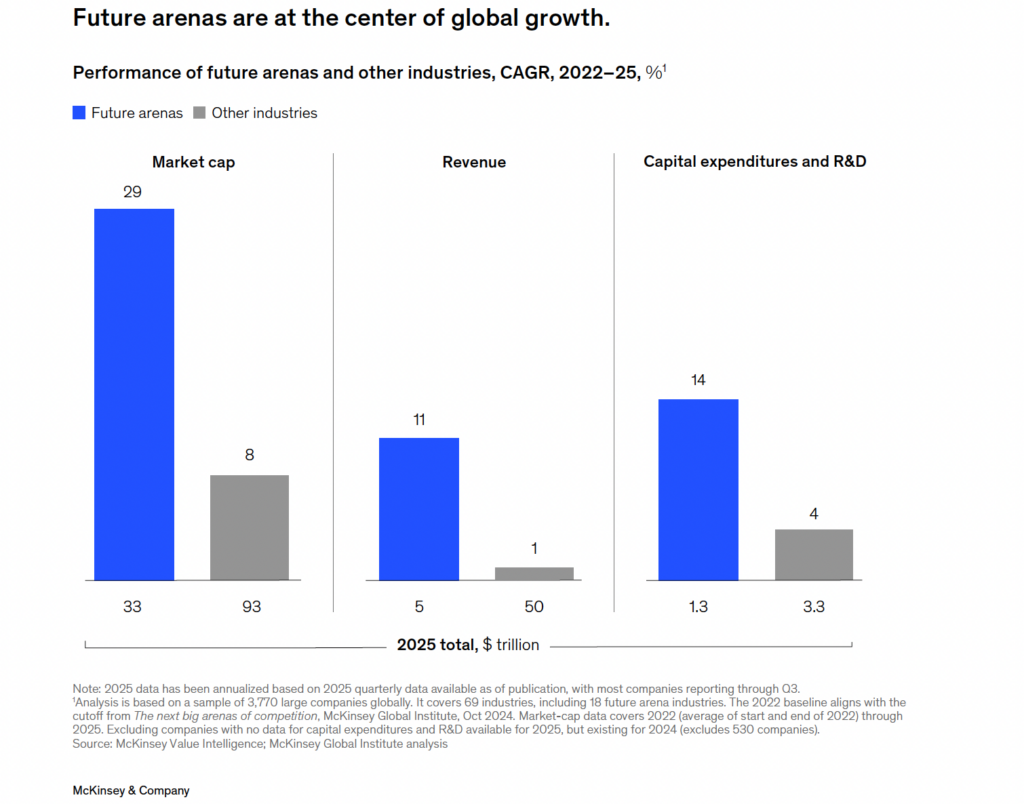 La economía global está entrando en una fase de transformación estructural impulsada por un conjunto de 18 industrias estratégicas denominadas “arenas, que abarcan desde la inteligencia artificial (IA) y los semiconductores hasta los vehículos eléctricos, la robótica o el espacio. Según un análisis del McKinsey Global Institute, estas actividades podrían generar entre 29 y 48 billones de dólares en ingresos anuales para 2040, y se consolidaráncomo el principal vector de crecimiento económico en las próximas décadas.