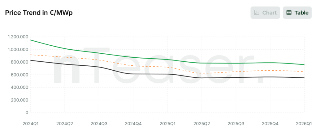 En el segmento de plantas en operación, el mercado ha absorbido una corrección relevante desde los máximos registrados a comienzos de 2024, cuando las valoraciones alcanzaban aproximadamente 1,1 millones de euros por MWp instalado. A mediados de 2025, los precios habían caído hasta niveles cercanos a los 785.000 €/MWp, en un ajuste impulsado principalmente por la caída de los precios de la electricidad en el mercado mayorista.