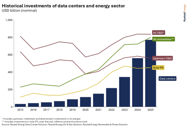 El crecimiento acelerado de la infraestructura digital está reconfigurando de forma estructural los flujos de inversión energética a escala global. Según un análisis reciente de Rystad Energy, el gasto de capital en centros de datos alcanzó los 770.000 millones de dólares en 2025, y superó así por primera vez la inversión destinada al upstream de petróleo y gas, lo que la sitúa en niveles comparables al conjunto del sector energético tradicional, incluyendo renovables y combustibles fósiles.