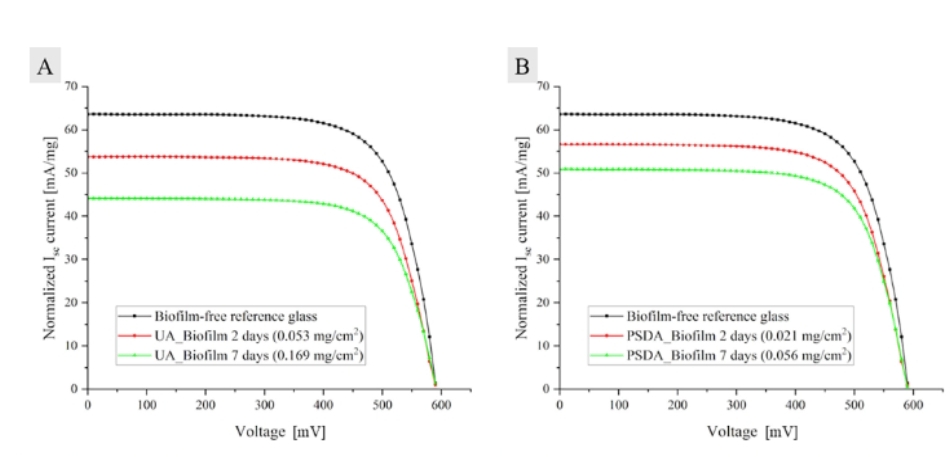 Para evaluar el impacto eléctrico, los investigadores realizaron ensayos acelerados de formación de biopelículas sobre vidrios fotovoltaicos en condiciones controladas de laboratorio. En esos experimentos, la colonización durante siete días se asoció con pérdidas de corriente de cortocircuito (Isc) de entre el 15,20 % y el 30,66 % en muestras de la Universidad de Antofagasta, y de entre el 11,01 % y el 20,12 % en muestras de la Plataforma Solar del Desierto de Atacama, en paralelo a un aumento de la biomasa superficial. La EPS aumenta la cohesión del depósito y puede reducir la eficacia de métodos convencionales de limpieza (cepillado en seco y enjuague), que pueden resultar parcialmente ineficaces frente a la matriz protectora.