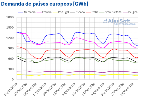 En la semana del 20 de abril, la demanda eléctrica disminuyó en la mayoría de los principales mercados europeos en comparación con la semana anterior. El mercado británico registró el mayor descenso, del 5,9%, seguido por los mercados francés, alemán e italiano, con caídas del 4,4%, 4,1% y 3,4%, respectivamente. Los mercados de la península ibérica registraron las menores bajadas, del 0,7% en España y del 0,6% en Portugal. La excepción fue el mercado belga, donde la demanda aumentó un 0,4% después de tres semanas consecutivas de descensos.