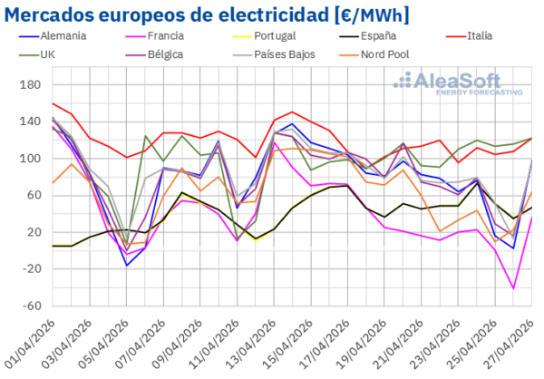 En la cuarta semana de abril, los precios de la mayoría de los principales mercados eléctricos europeos descendieron respecto a la semana anterior, favorecidos por la caída de la demanda y el incremento de la producción eólica y solar. La generación solar fotovoltaica alcanzó récords para un día de abril e incluso máximos históricos en mercados como el italiano, mientras los futuros de gas TTF y de petróleo Brent repuntaron por el aumento de la tensión geopolítica en Oriente Medio.