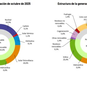 La primera fuente de producción en octubre ha sido el ciclo combinado, con un 23,6% del total; la eólica ha sido la segunda fuente, con el 20,3% del mix; y por detrás, se encuentra la solar fotovoltaica, que alcanza una cuota sobre la estructura de generación del 18,6%.