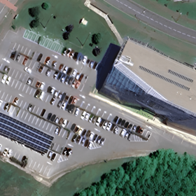 La marquesina cuenta con una cimentación de zapatas aisladas y estructura metálica, cubierta a un agua con una inclinación de 10°. Las dimensiones en planta son de 47 m * 10 m, con una altura mínima de 2,50 m y una máxima de 4,55 m.