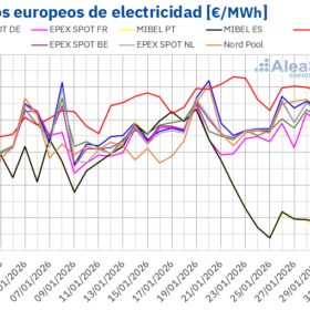 En la última semana de enero, los precios semanales de la mayoría de los principales mercados eléctricos europeos se situaron por encima de 110 €/MWh,exceptuando el mercado ibérico, que volvió a desacoplarse, con promedios cercanos a los 20 €/MWh.