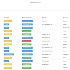 Orka Energía recoge todos los proyectos renovables en desarrollo en España, su estado de tramitación, su tecnología, la subestación a la que evacúan, el promotor, potencia instalada, resolución favorable o desfavorable, nombre del parque, tipo de trámite, y punto de acceso y conexión.