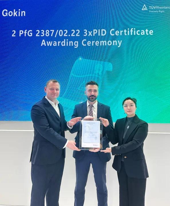 Uno de los aspectos más destacados de la expansión europea de Gokin es la entrega oficial de la certificación TÜV Rheinland 3-times PID (Potential Induced Degradation) durante una ceremonia celebrada en ENEX. Mientras que las pruebas estándar de PID garantizan una durabilidad básica, los módulos de Gokin han superado pruebas tres veces más exigentes que el estándar del sector.