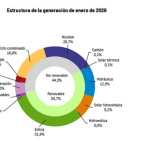 La eólica, la nuclear, el ciclo combinado, la hidráulica y la fotovoltaica han sido, en este orden, las tecnologías que han liderado el mix de España en enero. Por otro lado, la demanda aumentó un 2 % respecto a 2025.