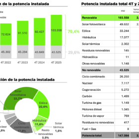 Solo en el cuarto trimestre se incorporaron 2.721 MW renovables, 2,7% más que en el 3T. La mayor parte correspondió a la solar fotovoltaica, que añadió 2.556 MW (+5,4%) hasta alcanzar 49.632 MW a finales de diciembre.